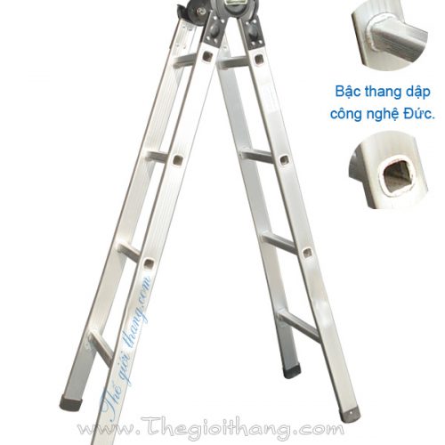Cao 1,5m: 450.000 VNĐ. Khi duỗi thẳng cao 3m. Thang có 4 bậc. có thể dễ dàng chuyển đổi cấu hình sử dụng khác nhau nhờ lẫy khóa tự động của thang.